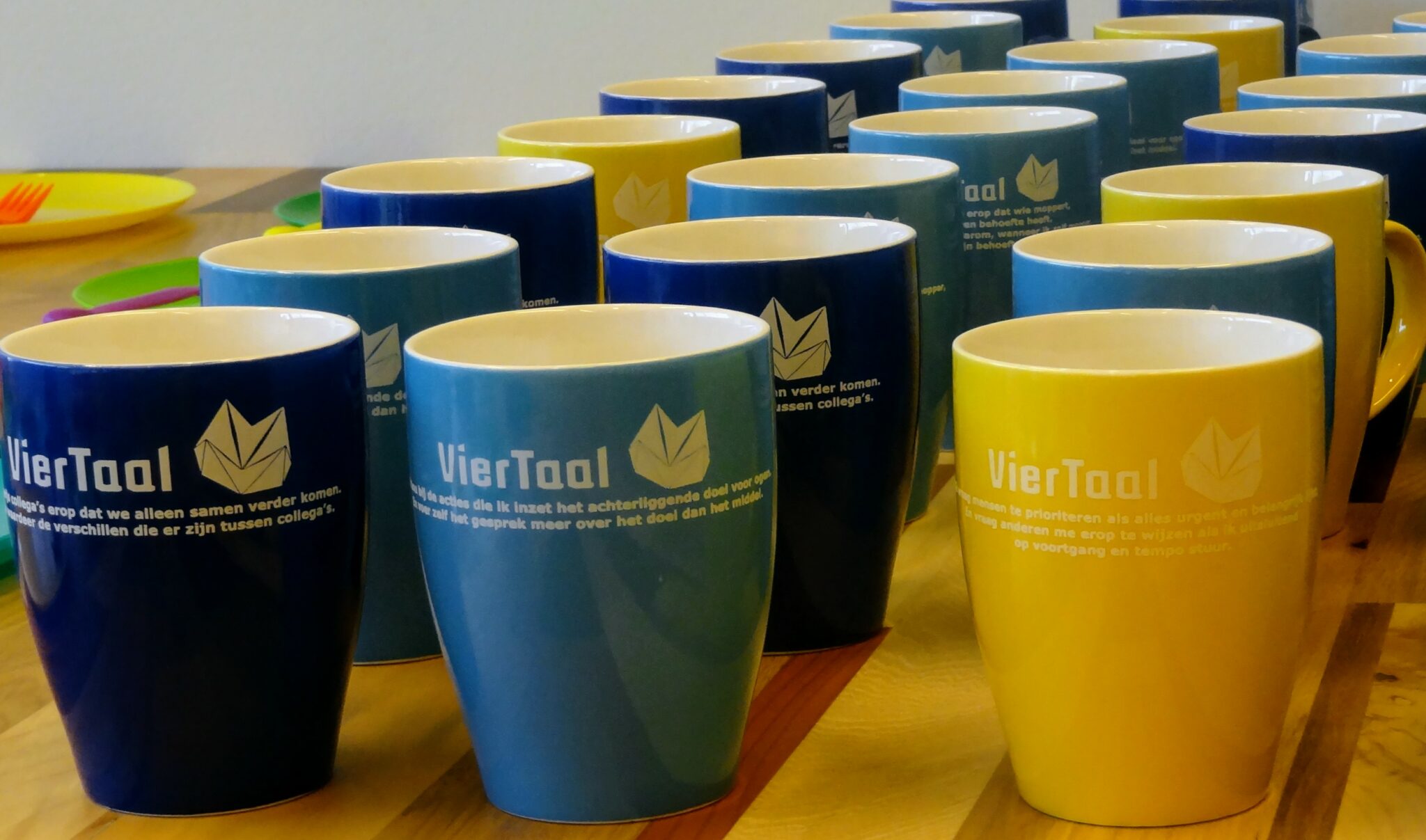 Gisterenmiddag zijn op het VierTaal College deze mokken en de muismatten met een feestelijke borrel aangeboden aan het team van het VierTaal College en de ambulante dienst.